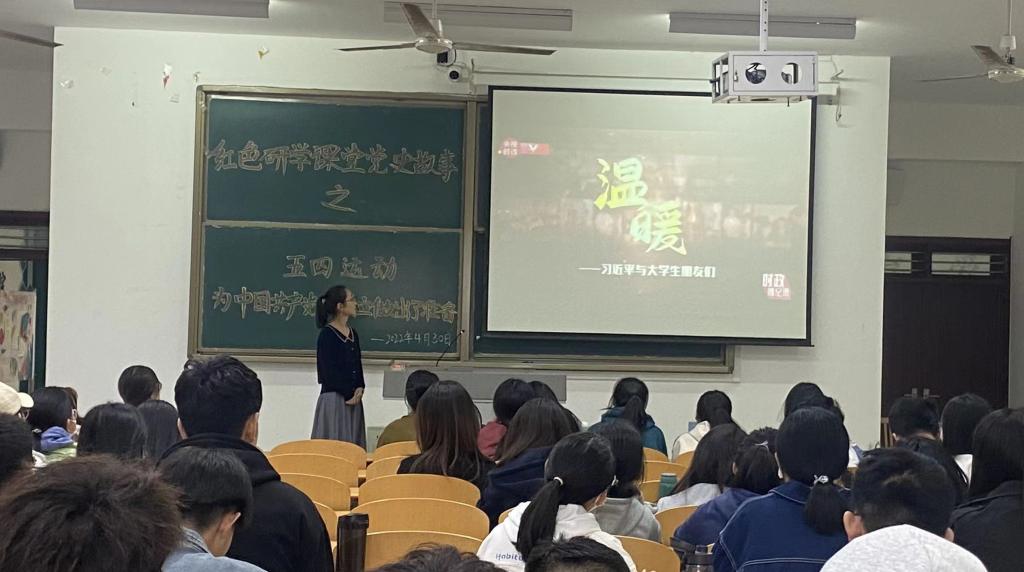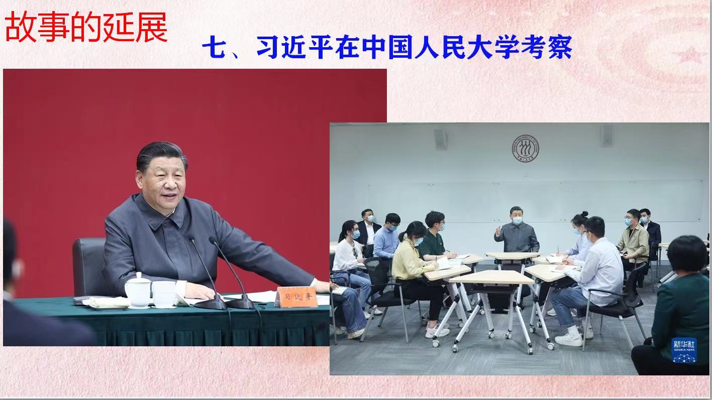 在课程研学中,同学们结合故事内容,通过“红色云展厅”的相关视频赏析、习近平考察中国人民大学时与老员工朋友们的温暖瞬间等,分享了五四精神的科学内涵对青年发展的启示、中国共产党人独特的价值追求的领悟、第二个百年奋斗历程中新青年新时代的使命与担当等体会和感想。