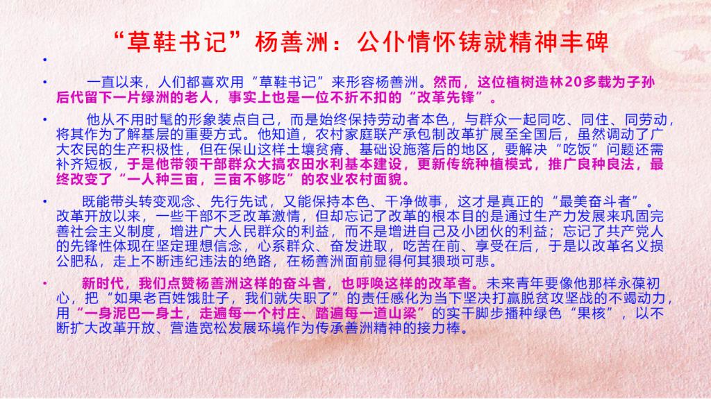 主讲教师左海静结合《习近平讲党史故事》书目中改革开放和社会主义现代化建设新时期的12个故事,选取了“邓小平与党的十一届三中全会”、“一辈子的共产党人杨善洲”两个内容,重点讲述了本课程第五个和第六个故事,从故事的原委、故事的延展和故事的启迪三个方面分享了改革开放精神。