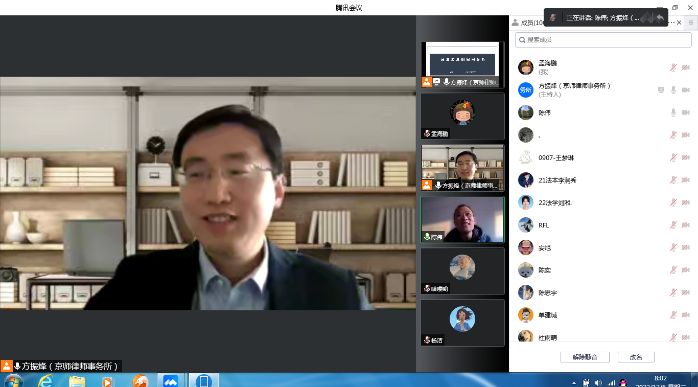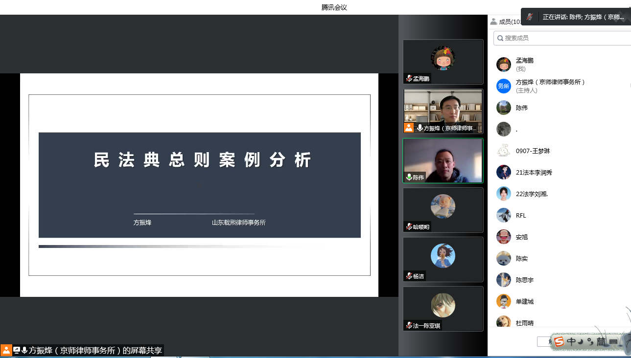 2022年12月6日,山东载熙律师事务所方振烽律师通过腾讯会议为ladbrokes立博2022级法学本科员工授课。方律师结合实务工作中所办理的案例,讲解了《民法典》总则部分的民事主体、民事法律行为、代理、诉讼时效、法律文书写作等内容。授课通过对具体案例的细节分析,贯穿涵盖了民法总论的多个重要知识点,内容生动丰富,受到同学们的好评。