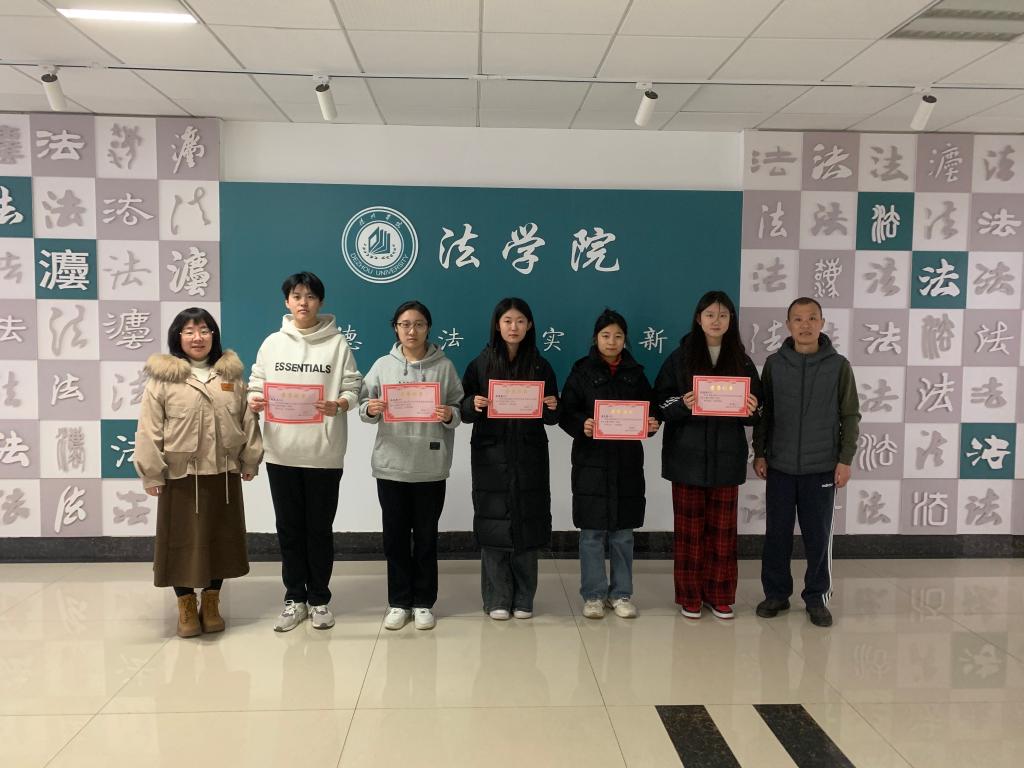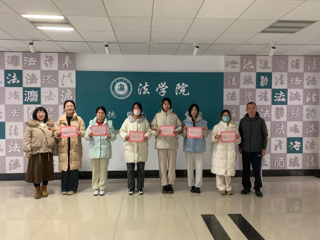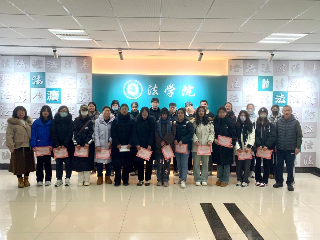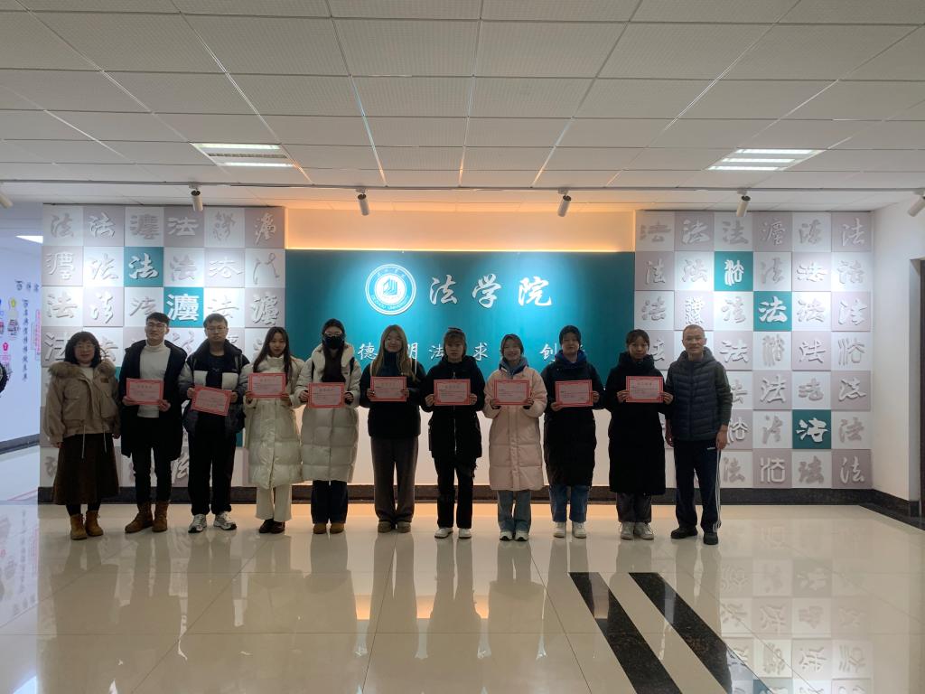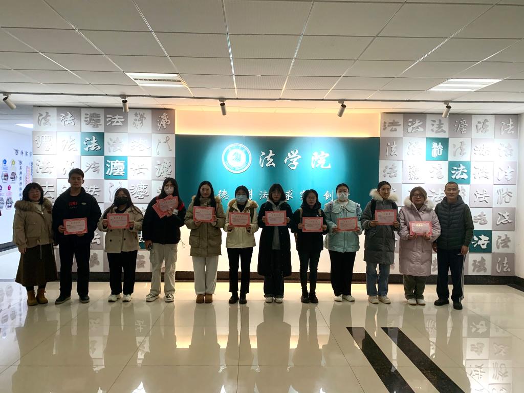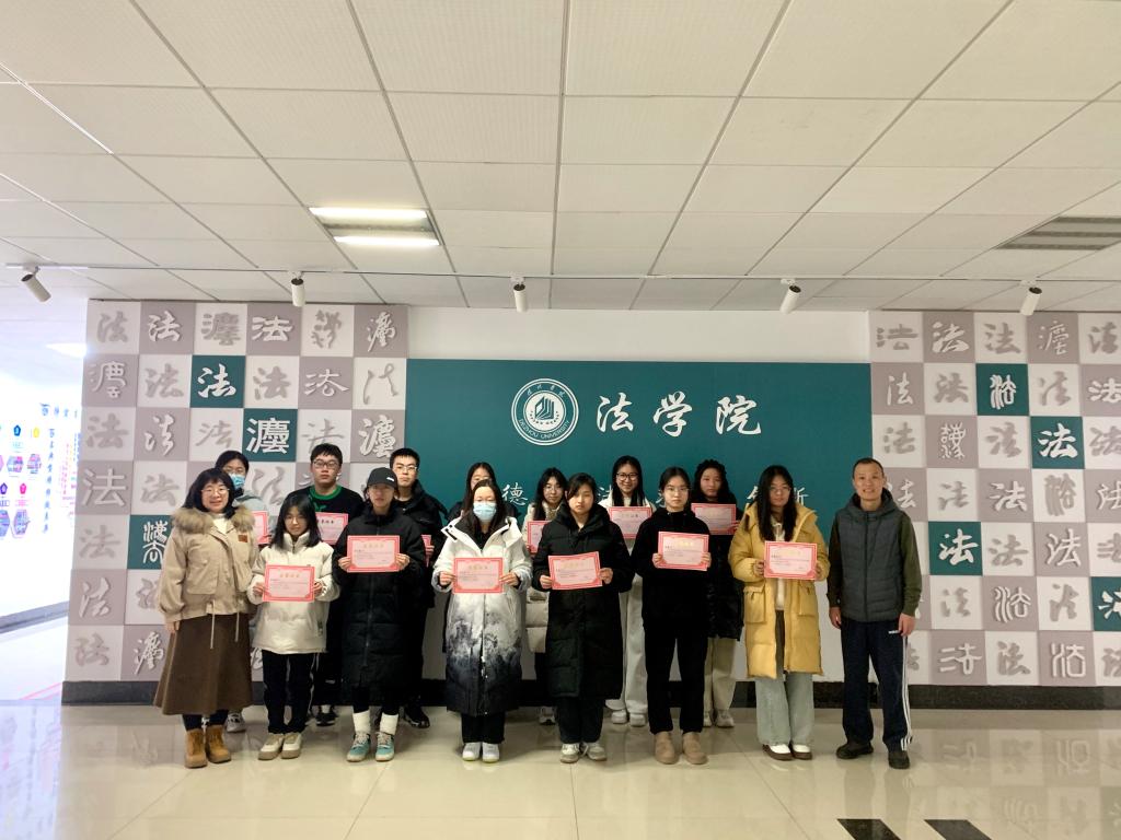 比赛共评出2023级法学本科一等奖5位,二等奖10位,三等奖15位;2023级法学专升本一等奖10位,二等奖15位,三等奖25位。课程负责人陈伟老师、本项实践教学环节主持人田莹莹博士为获奖同学颁奖,并与同学们在“百法图”前合影留念。