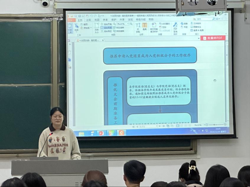 本次培训会议由院员工会分管主席公瑶主持,她从申请入团、入团积极分子的确定、入团积极分子的教育、培养和考察、发展对象的确定、新团员的接受六个部分具体阐述了发展团员工作流程,并结合公司实际,为同学们介绍了《共青团推优入党工作实施方案》,具体介绍了推优入党的范围、条件和比例等。她鼓励学员们作为新时代青年,要努力奋斗,勇于担当时代使命,传承红色精神。