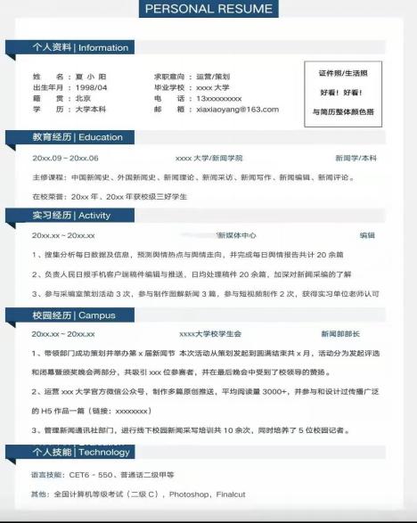 5、照片用证件照或者好看的他拍照,与简历主色调协调即可,不要放带着贴纸的自拍照,简约大方是标准。