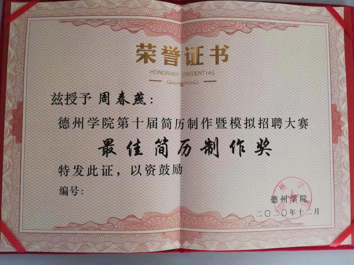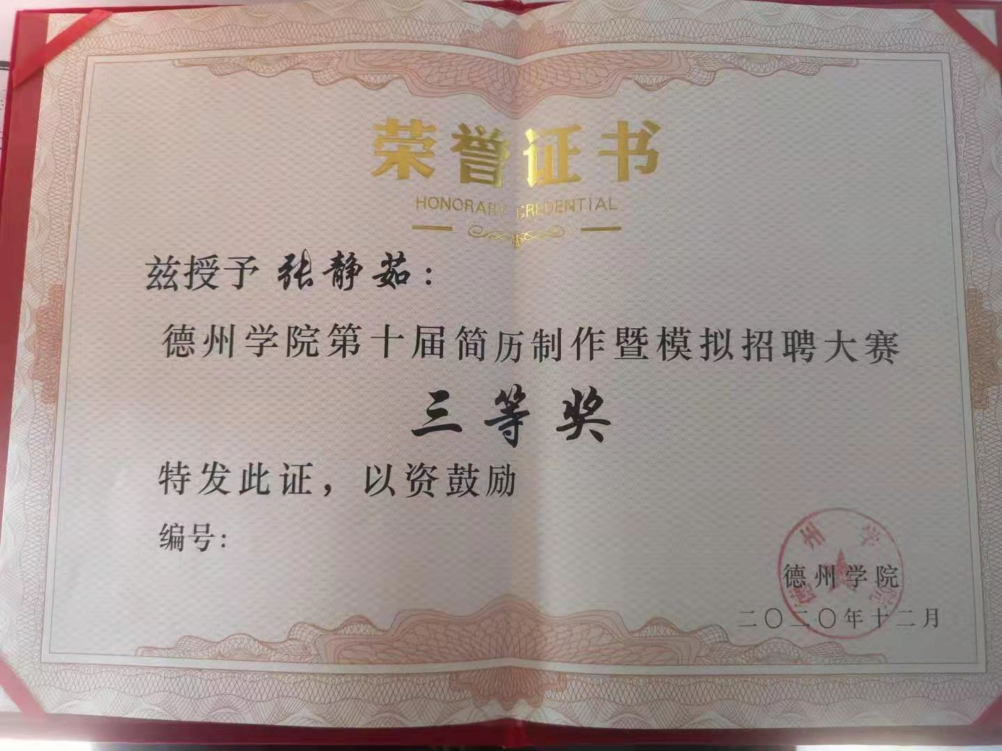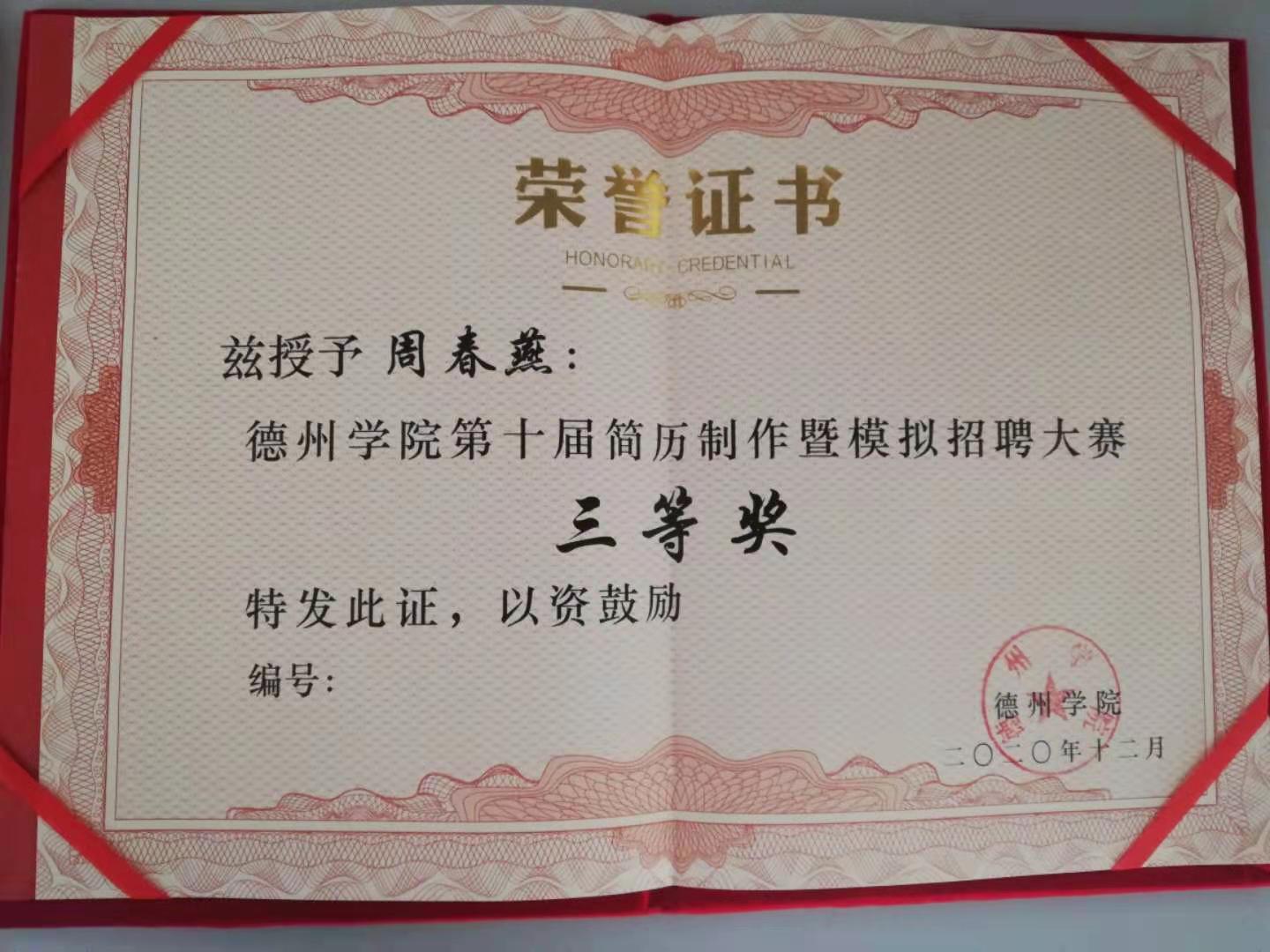 张静茹、周春燕同学在公司简历及模拟招聘大赛获奖