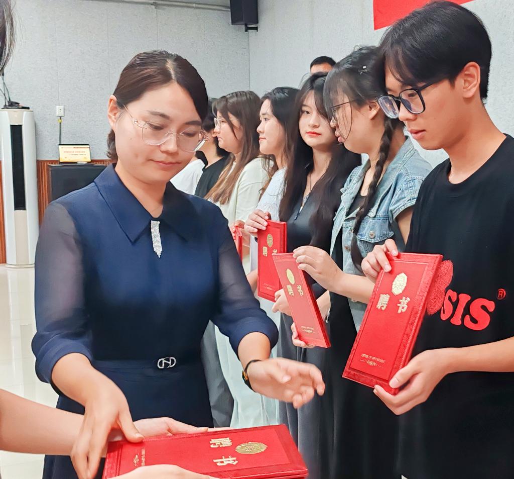 为帮助公司2024级员工快速适应、更好融入大学学习和生活,协助老师高效完成员工管理工作和班级初期建设工作,来自2023级法学、行政管理专业的10名同学,被公司聘请为2024级新生朋辈班级助理,公司党委书记武珊珊为其颁发聘书。