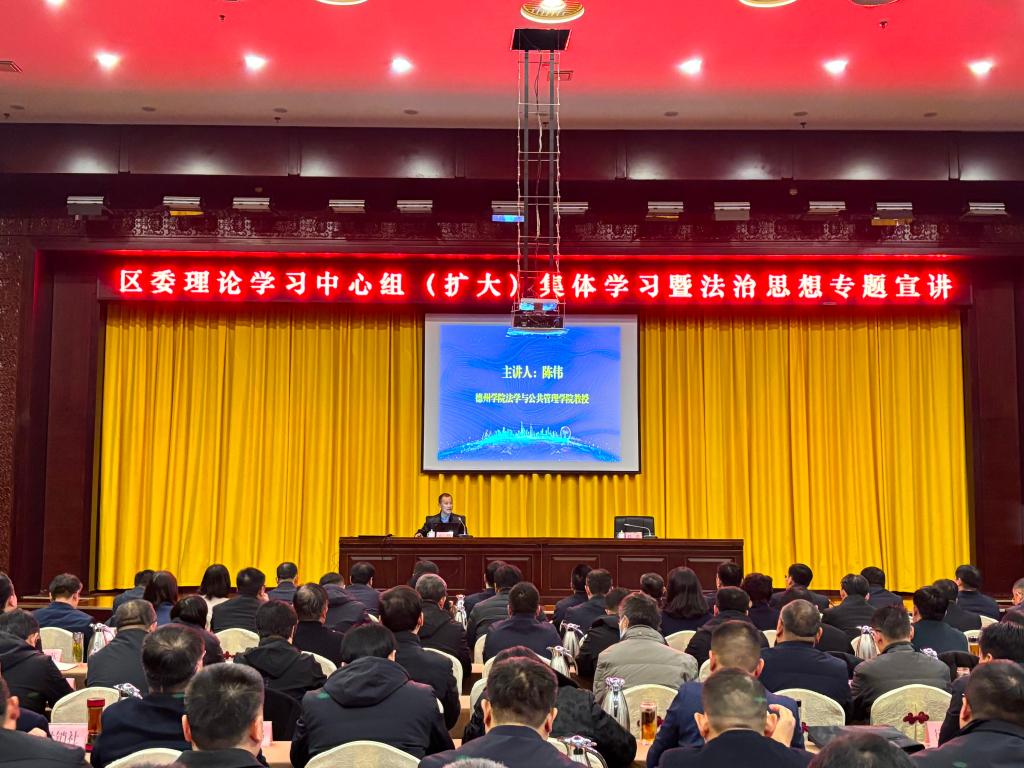 按照市全面依法治市办公室统一安排,12月11日,公司陈伟教授为陵城区委理论学习中心组(扩大)集体学习会议作习近平法治思想专题报告。陵城区委常委、副区长任营主持会议,陵城区委区政府及各部门、各乡镇主要负责同志等300余人参加报告会。