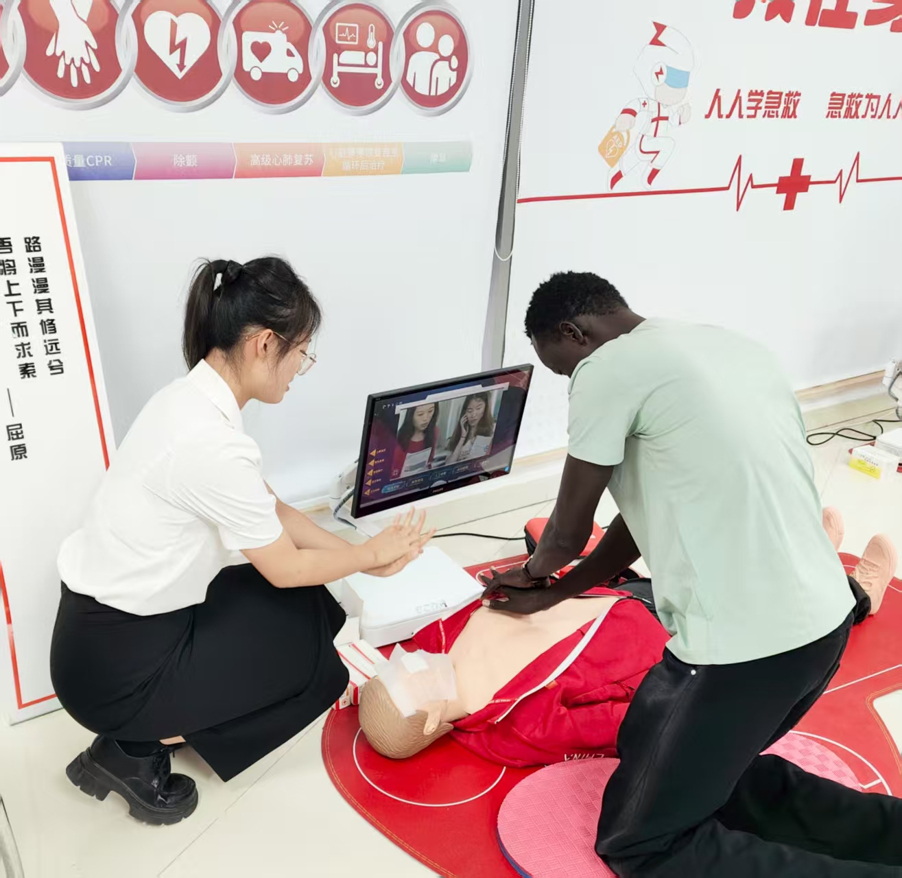 张莹莹同学还与参会领导和外宾学员一同考察省红十字会应急救护培训基地,详细了解基地的应急救护实训设施,并进行心肺复苏实操演练,对专业规范的应急救护培训流程有了更直观的认知,也为公司后续开展更具实操性、开放性的应急救护教学与交流活动开拓了视野、积累了经验。
