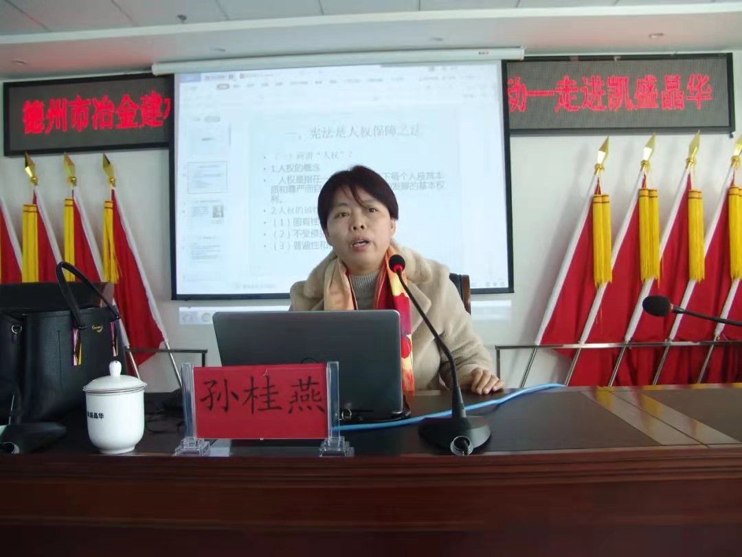 12月4日上午,在第七个国家宪法日到来之际,ladbrokes立博孙桂燕副教授应邀为凯盛晶华玻璃有限公司做宪法宣传报告。德州市总工会党组成员、副主席孙刚同志,德州市总工会法律部部长英波同志,凯盛晶华玻璃有限公司副总经理、工会主席辛长平同志,凯盛晶华玻璃有限公司干部职工代表共计50余人听取了宪法宣讲报告。