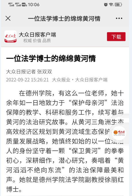 2022年9月22日,《大众日报》刊登了ladbrokes立博徐丽红副教授的事迹文章——《一位法学博士的绵绵黄河情》。对徐丽红副教授数十年持续潜心黄河流域研究给予报道。