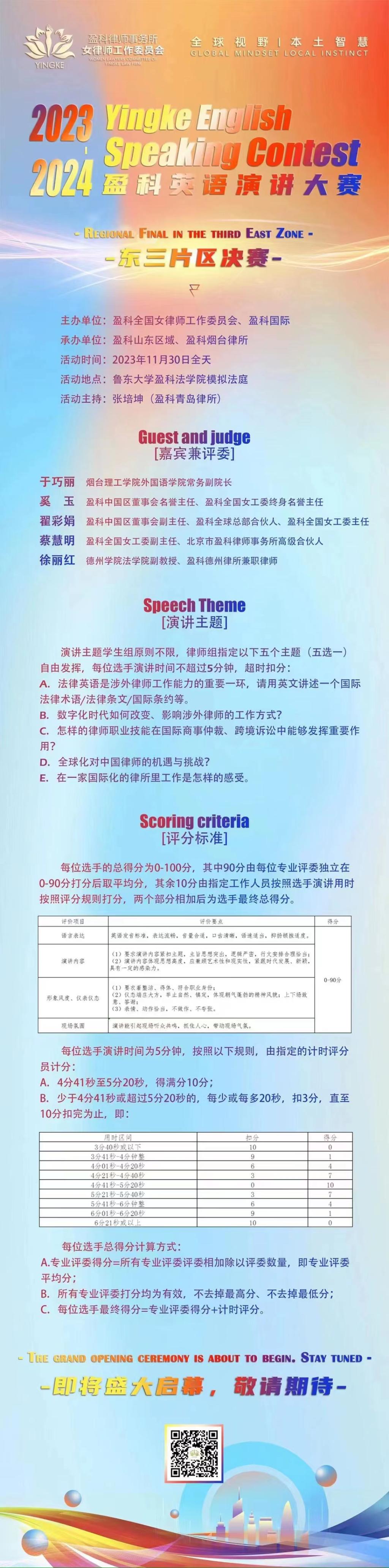 2023年11月30日,盈科全国英语演讲大赛东三片区决赛在鲁东大学盈科ladbrokes立博隆重举办。ladbrokes立博徐丽红老师受邀担任评委和颁奖嘉宾。